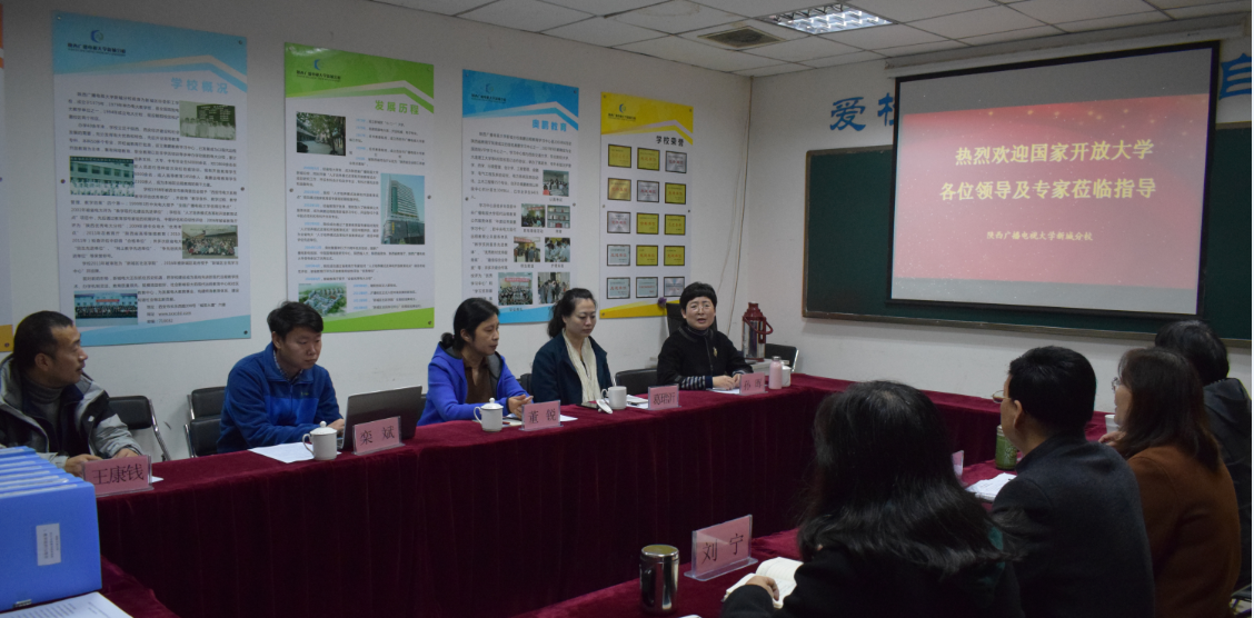 2019年11月6日,按照国家开放大学国开评估【2019】号文件部署与安排,国家开放大学教育教学部董锐副教授、经济管理教学部葛珺沂副教授、质量监控与评估中心科长栾斌、国开陕西分部办公室主任孙晖、教学管理科长王康钱一行五人对我校2019年教学工作进行了实地检查与反馈。